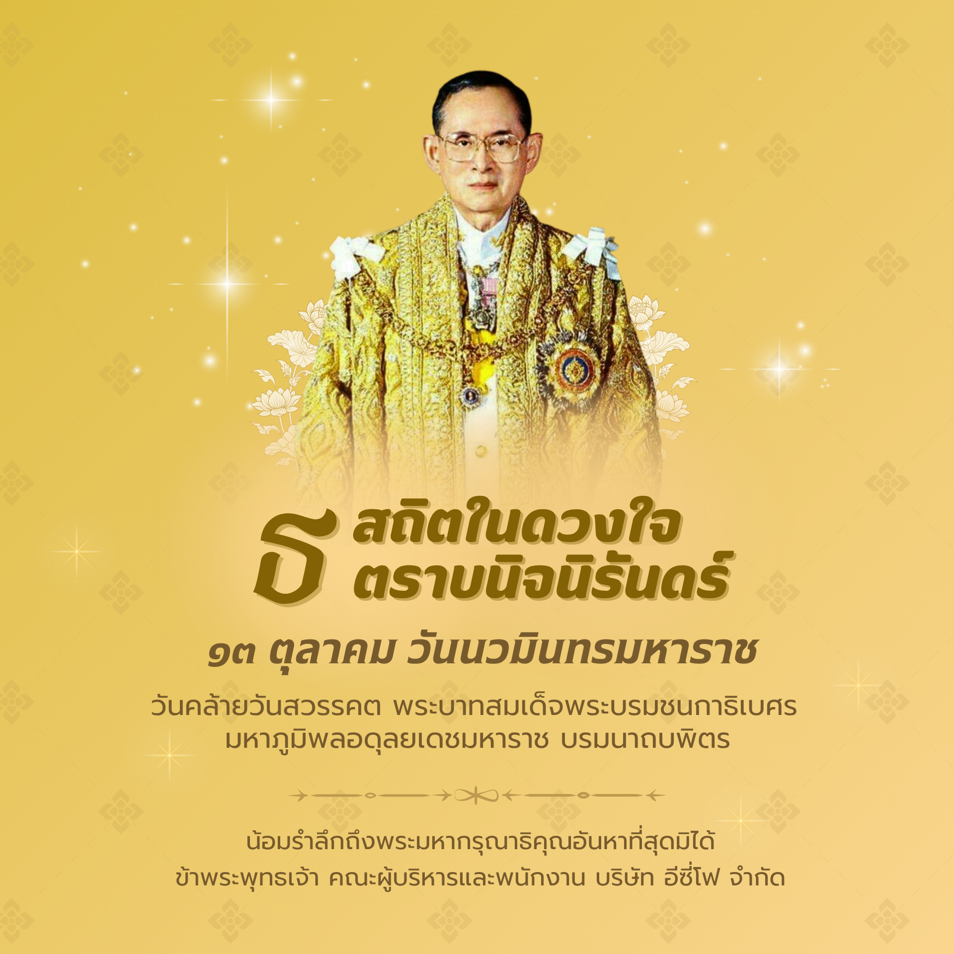 วันคล้ายวันสวรรคต พระบาทสมเด็จพระบรมชนกาธิเบศร มหาภูมิพลอดุลยเดชมหาราช บรมนาถบพิตร 💛 น้อมรำลึกในพระมหากรุณาธิคุณอันหาที่สุดมิได้ ด้วยเกล้าด้วยกระหม่อม ข้าพระพุทธเจ้า คณะผู้บริหารและพนักงานบริษัท อีซี่โฟ จำกัด 🙏🏻