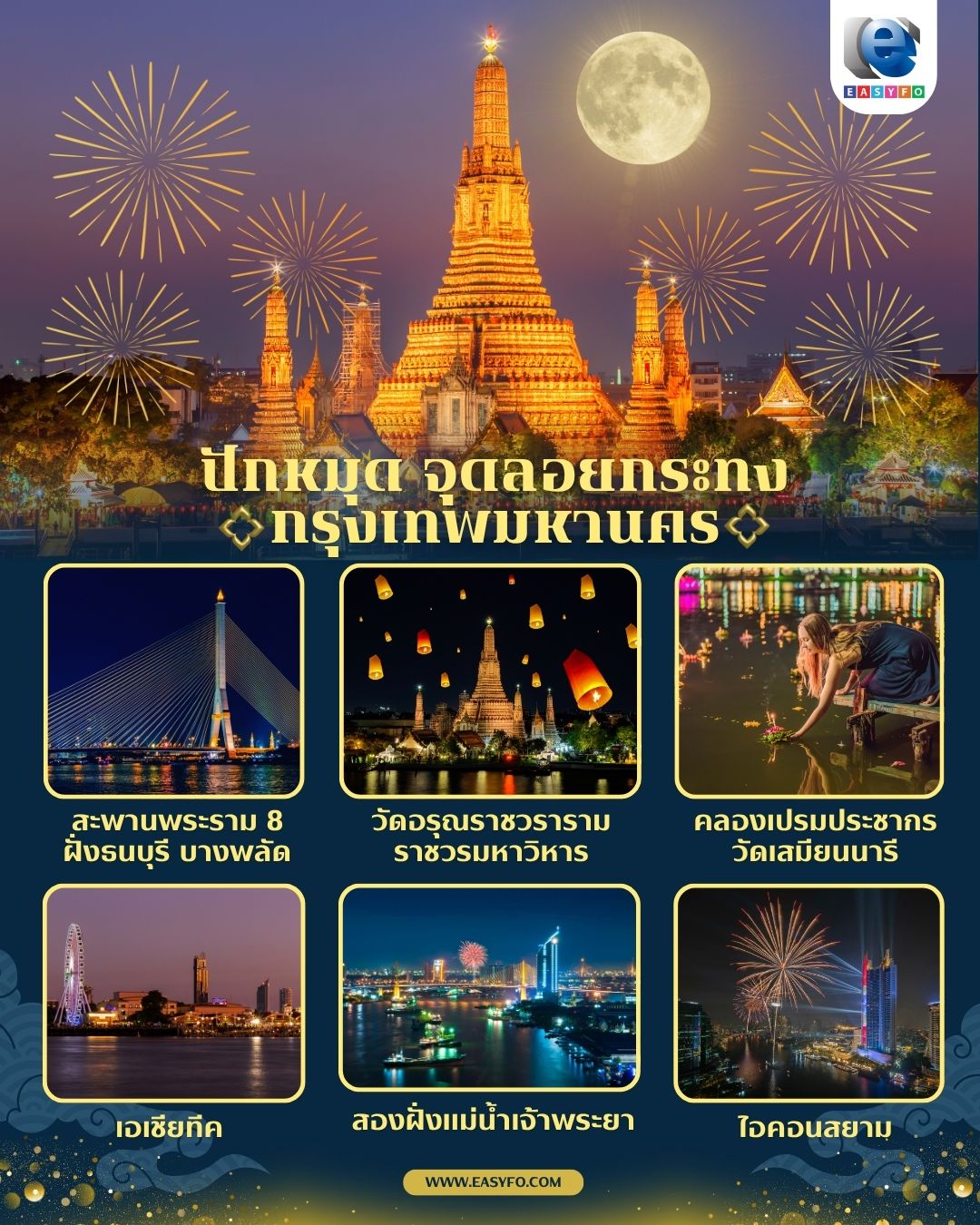 ✅สะพานพระราม 8 ฝั่งธนบุรี เขตบางพลัด ✅คลองเปรมประชากร ณ วัดเสมียนนารี พระอารามหลวง เขตจตุจักร ✅งานประเพณีลอยกระทง ไท ไทย คารวาลัยพระแม่ของแผ่นดิน ณ วัดอรุณราชวรารามราชวรมหาวิหาร จัดโดย กระทรวงวัฒนธรรม ✅งาน ICONSIAM THAICONIC LOY KRATHONG ร้อยใจไทย รักษ์สายธารเจ้าพระยา ณ River Park ไอคอนสยาม จัดโดย ไอคอนสยาม ✅งาน Bangkok River Festival 2025 ณ ริมแม่น้ำเจ้าพระยา โครงการเอเชียทีค เดอะ ริเวอร์ฟร้อนท์ จัดโดย เอเชียทีค เดอะ ริเวอร์ฟร้อนท์ ✅งาน "ลอยกระทงกตัญญูแม่พระคงคา บูชาแม่ของแผ่นดิน" บนพื้นที่ 9 ท่าน้ำสำคัญทางประวัติศาสตร์ริมแม่น้ำเจ้าพระยาในกรุงเทพมหานคร จัดโดย บริษัท ไทยเบฟเวอเรจ จำกัด (มหาชน) ✅งาน "วิจิตรเจ้าพระยา 2568" ณ ริมสองฝั่งแม่น้ำเจ้าพระยา กรุงเทพมหานคร จัดโดย การท่องเที่ยวแห่งประเทศไทย (ททท.)