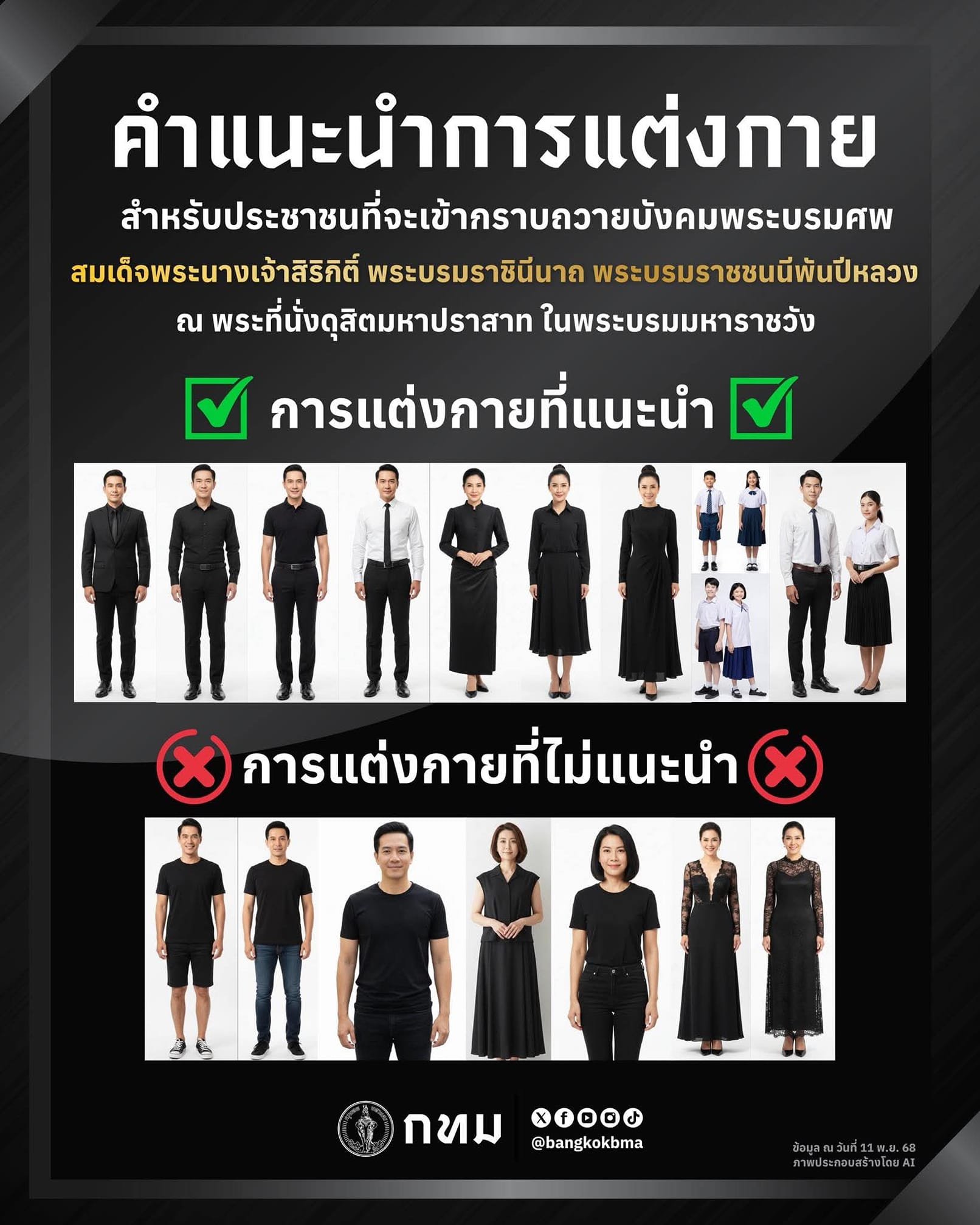 🚩คำแนะนำการแต่งกาย เข้ากราบถวายบังคมพระบรมศพ สมเด็จพระนางเจ้าสิริกิติ์ พระบรมราชินีนาถ พระบรมราชชนนีพันปีหลวง ณ พระที่นั่งดุสิตมหาปราสาท ในพระบรมมหาราชวัง 🙏ด้วยน้อมสำนึกในพระมหากรุณาธิคุณอย่างหาที่สุดมิได้ที่มา : Facebook กรุงเทพมหานคร