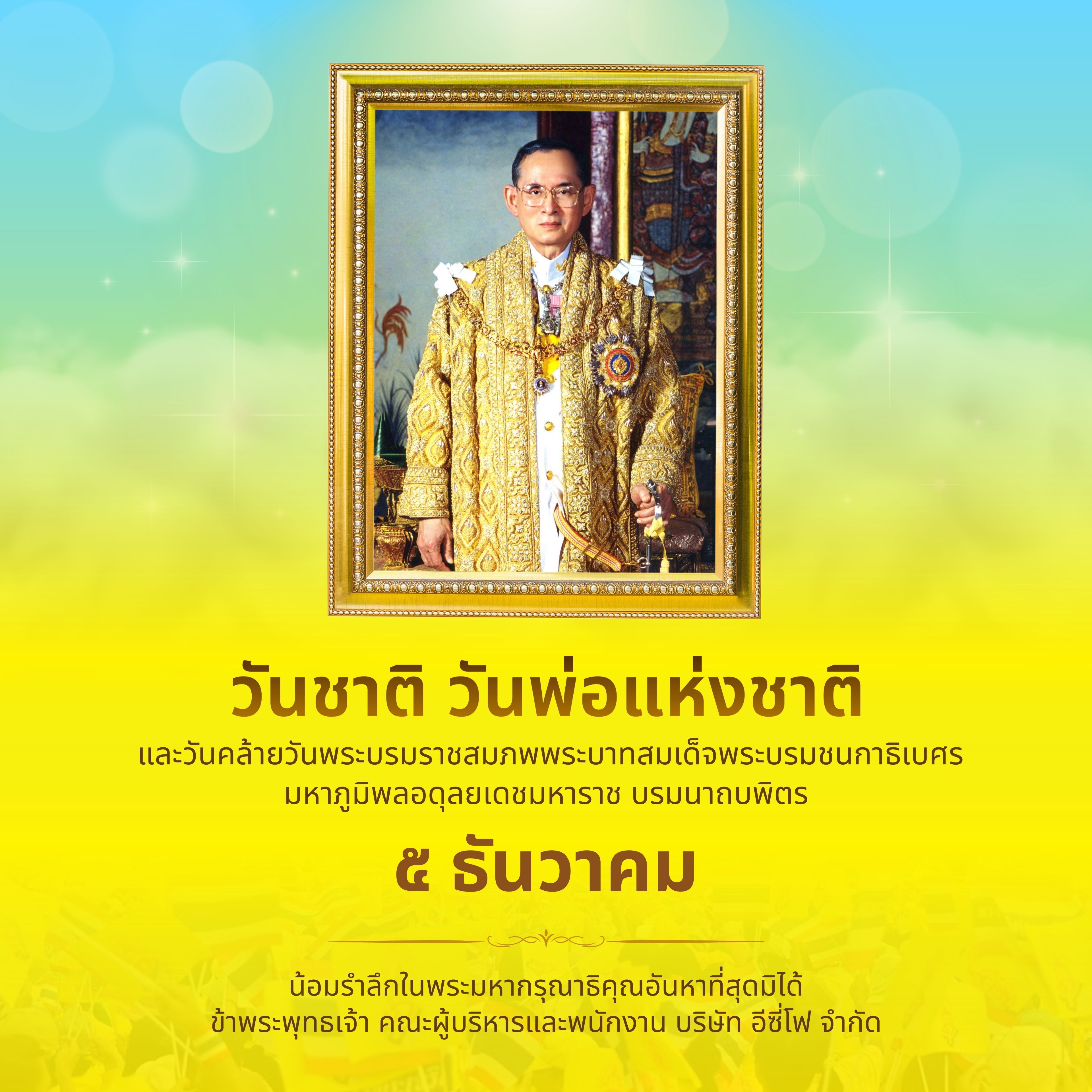วันชาติ วันพ่อแห่งชาติ และวันคล้ายวันพระบรมราชสมภพพระบาทสมเด็จพระบรมชนกาธิเบศร มหาภูมิพลอดุลยเดชมหาราช บรมนาถบพิตร น้อมรำลึกในพระมหากรุณาธิคุณอย่างหาที่สุดมิได้ข้าพระพุทธเจ้า คณะผู้บริหารและพนักงาน บริษัท อีซี่โฟ จำกัด