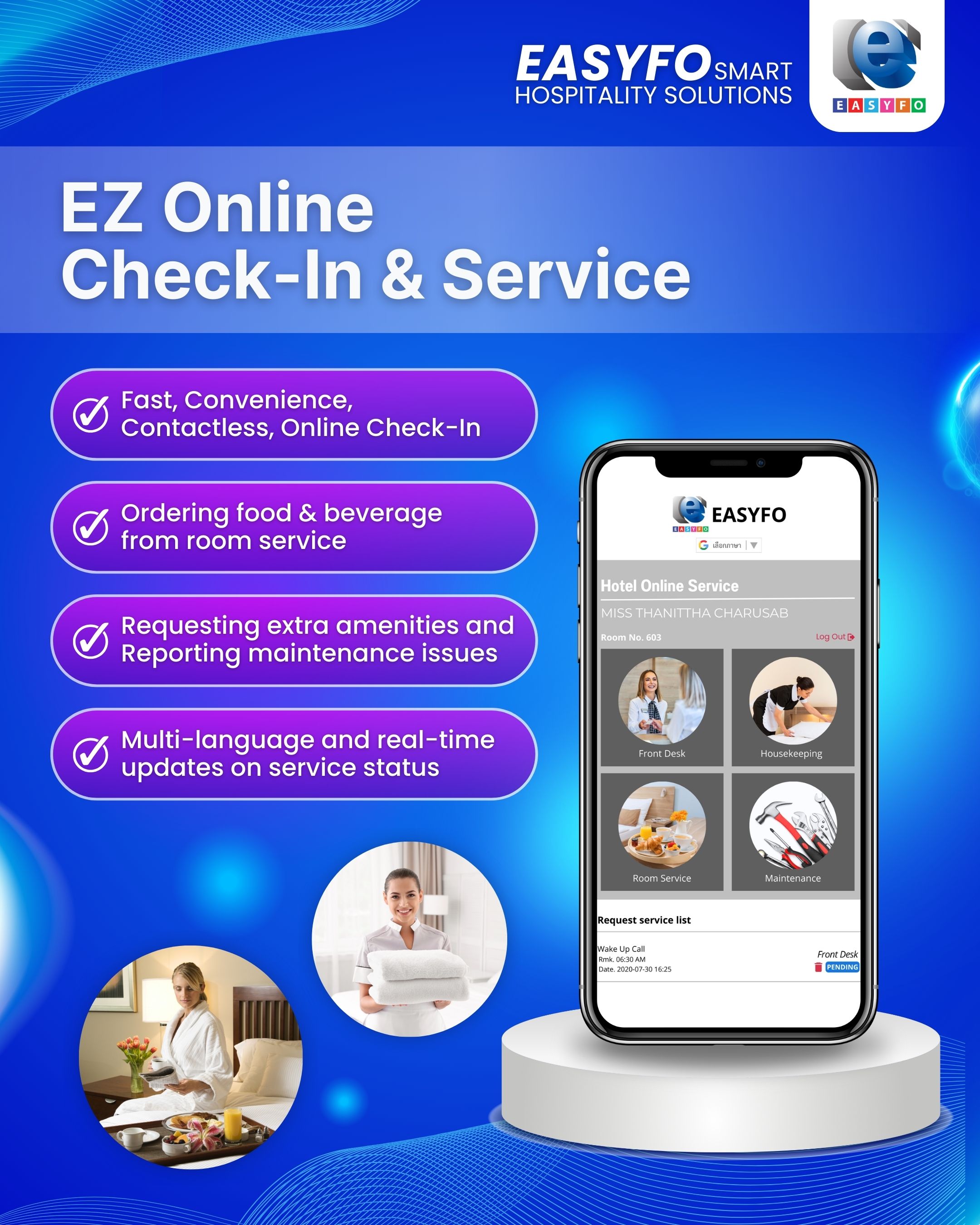 EZ Online Check-in & Service is a mobile/digital solutions for hotels that allows customers to manage their arrival and access services using their own mobile device, typically by scanning a QR code or using a link/mobile app. |
