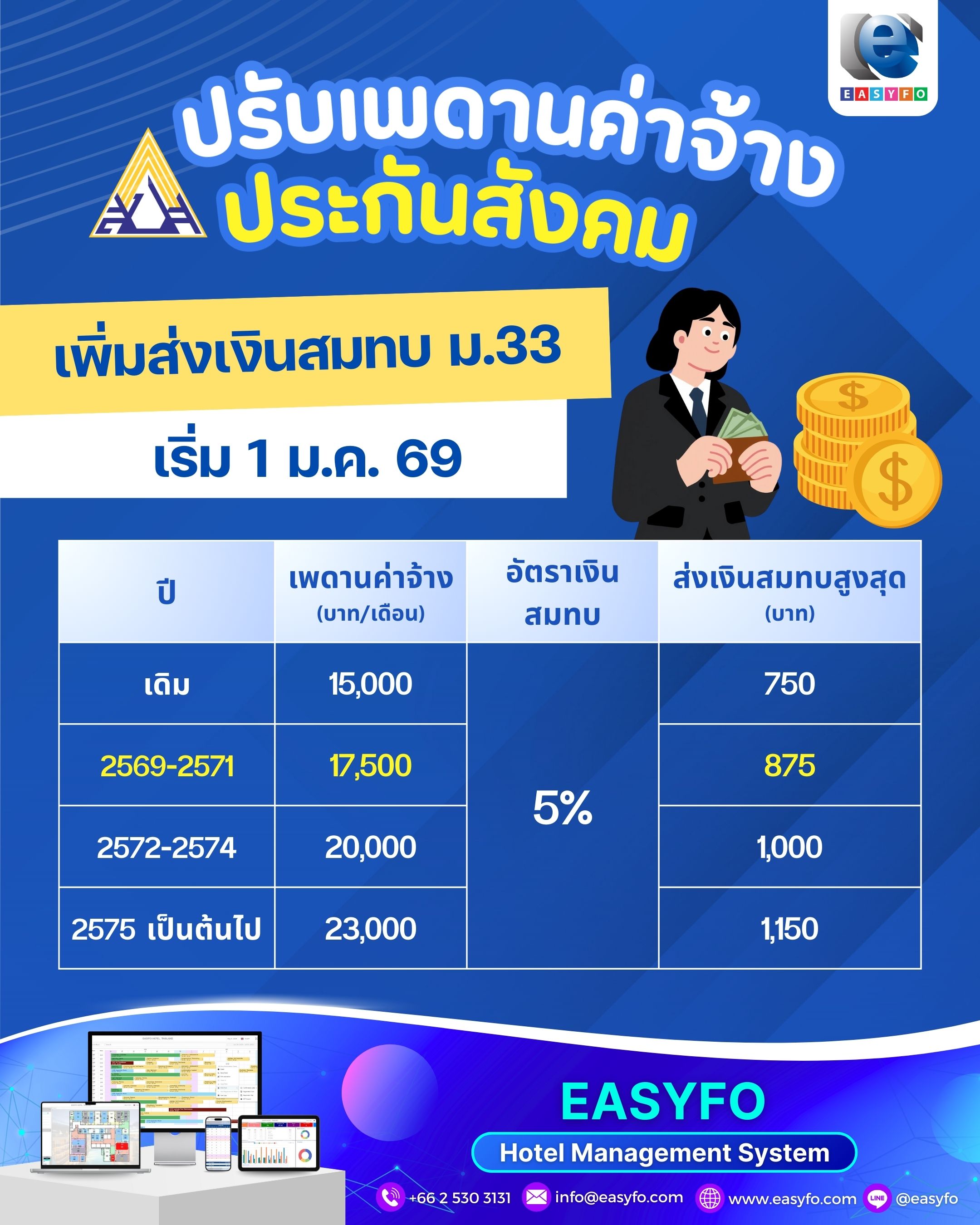 ปรับเพดานค่าจ้างแบบขั้นบันได ทุกๆ 3 ปี โดยแบ่งดังนี้ - ระยะที่ 1 (ปี พ.ศ.2569–2571) เพดานค่าจ้างสูงสุด 17,500 บาท เงินสมทบสูงสุด 875 บาทต่อเดือน - ระยะที่ 2 (ปี พ.ศ.2572–2574) เพดานค่าจ้างสูงสุด 20,000 บาท เงินสมทบสูงสุด 1,000 บาทต่อเดือน - ระยะที่ 3 (ปี พ.ศ.2575 เป็นต้นไป) เพดานค่าจ้างสูงสุด 23,000 บาท เงินสมทบสูงสุด 1,150 บาทต่อเดือน
