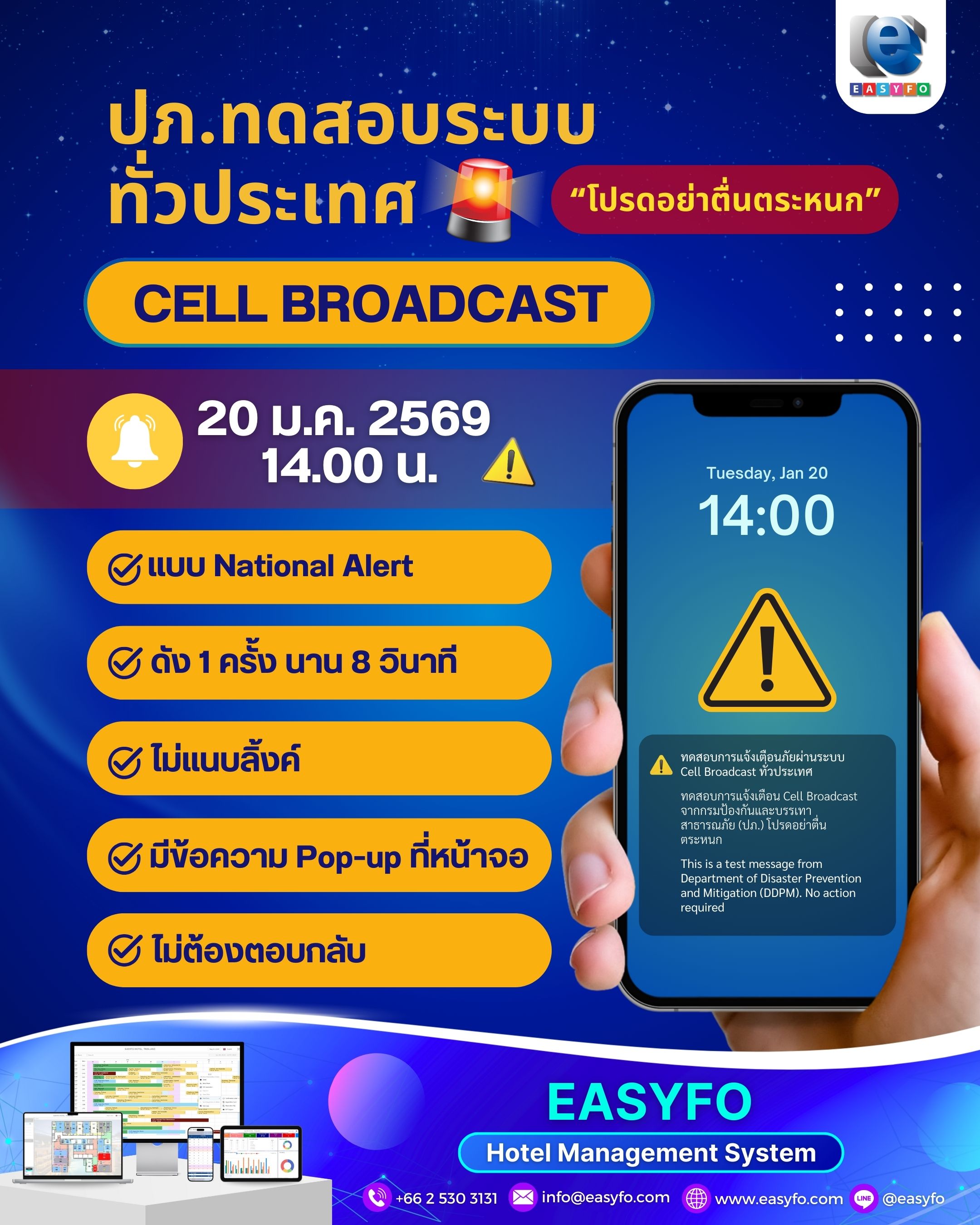 ปภ.เตรียมทดสอบการแจ้งเตือนภัยผ่านระบบ Cell Broadcast ทั่วประเทศ วันที่ 20 ม.ค. 69 เวลา 14.00 น. โดยจะมีเสียงดัง 1 ครั้ง ประมาณ 8 วินาที พร้อมกับมีข้อความ Pop-up อัตโนมัติที่หน้าจอมือถือ ระบบปฏิบัติการที่รองรับ - iOS เวอร์ชัน 18 ขึ้นไป - Android เวอร์ชัน 11 ขึ้นไป