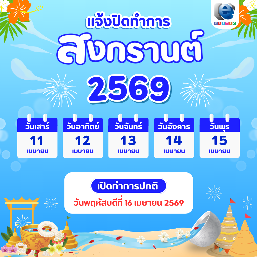 เปิดทำการปกติในวันพฤหัสบดีที่ 16 เมษายน 2569 ---------------- กรณีเร่งด่วน กรุณาติดต่อ Call Center : +66 2 530 3131 Line ID: @easyfo Email : support@easyfo.com ----------------ㅤ ขออภัยในความไม่สะดวก
